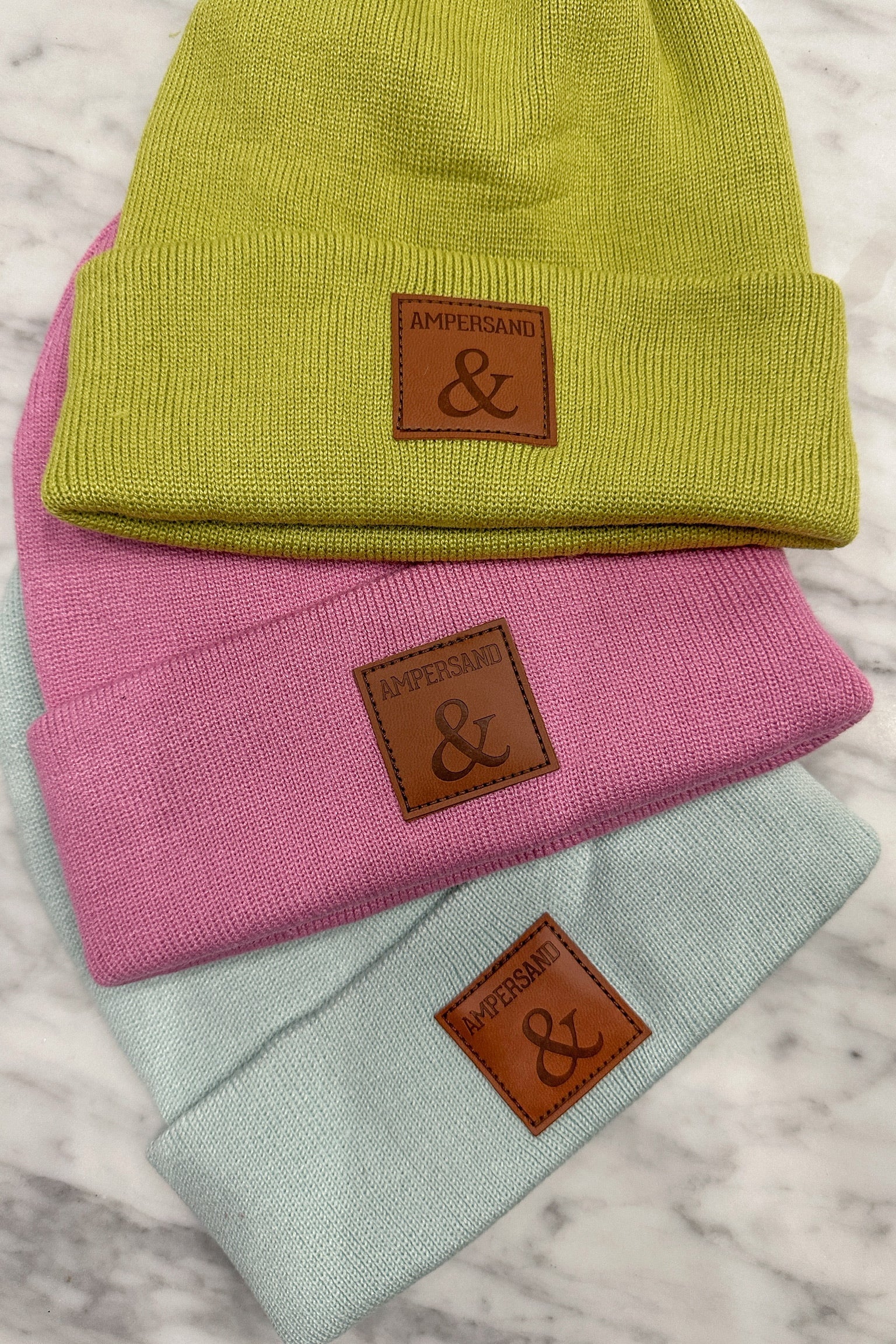 A set of sky blue, carnation & lime cuffed beanies with embossed Ampersand Ave vegan leather patch.