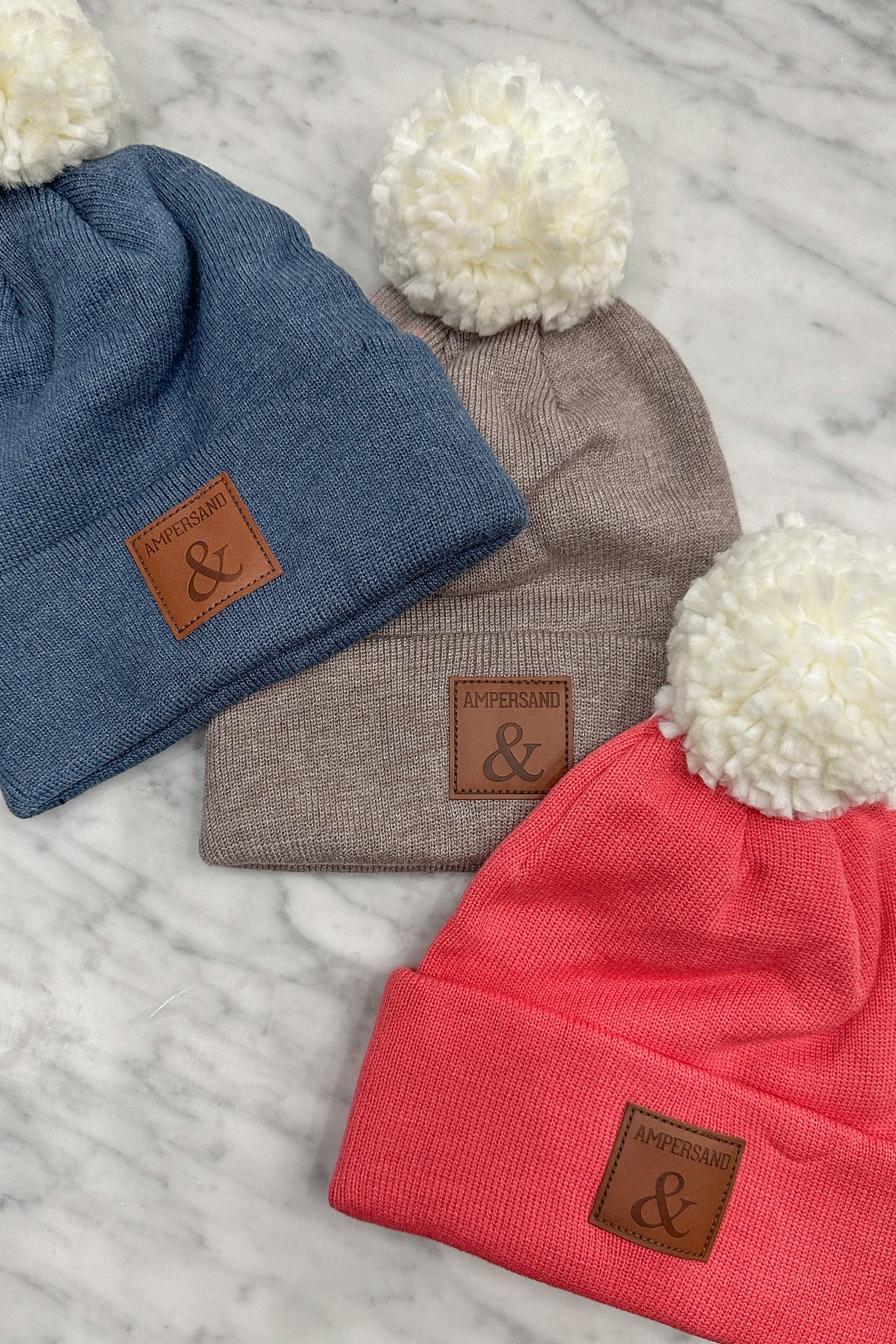 A set of almond, watermelon & denim cuffed beanies with embossed Ampersand Ave vegan leather patch and a pom on top.