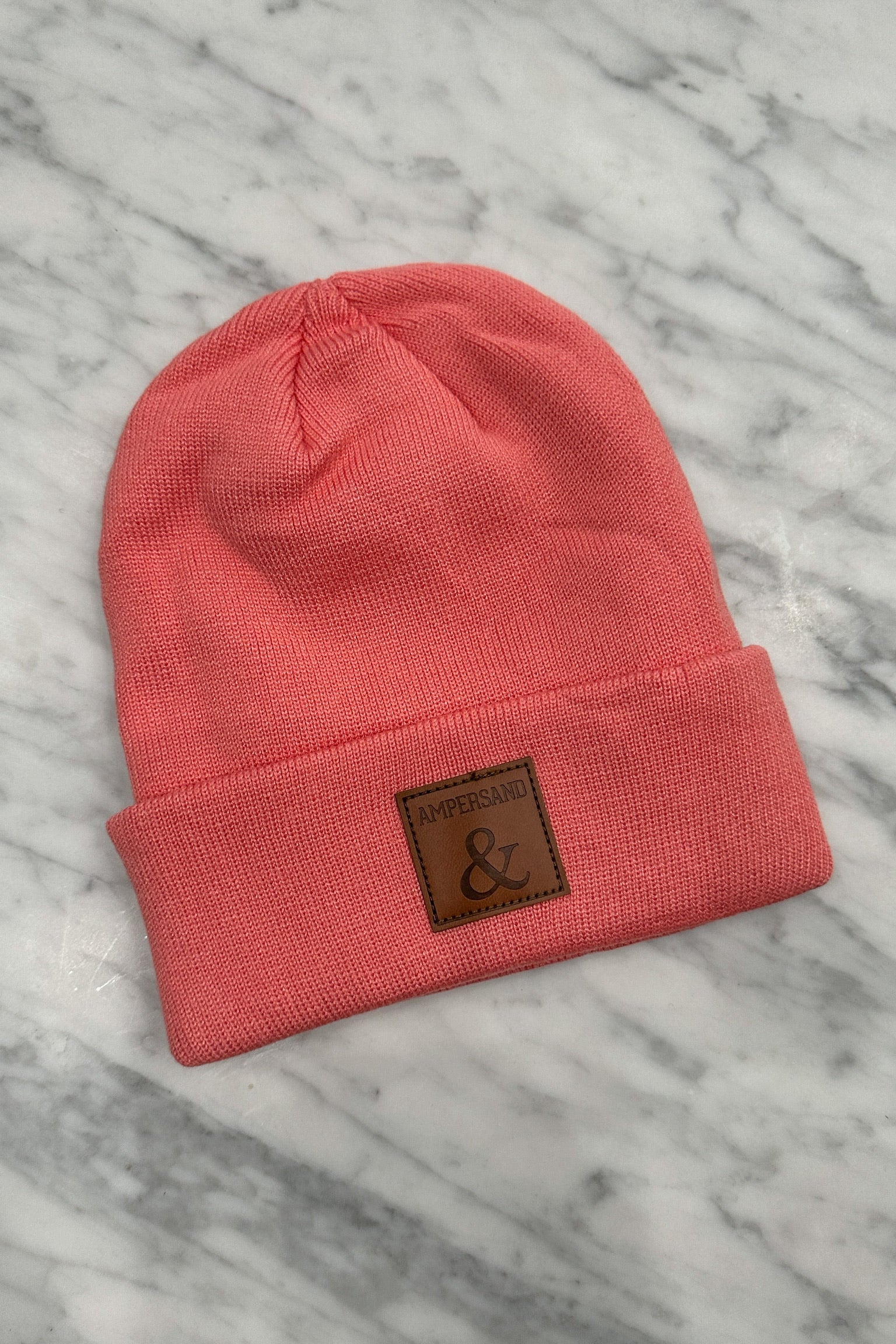 Allover coral cuffed beanie with embossed Ampersand Ave vegan leather patch.