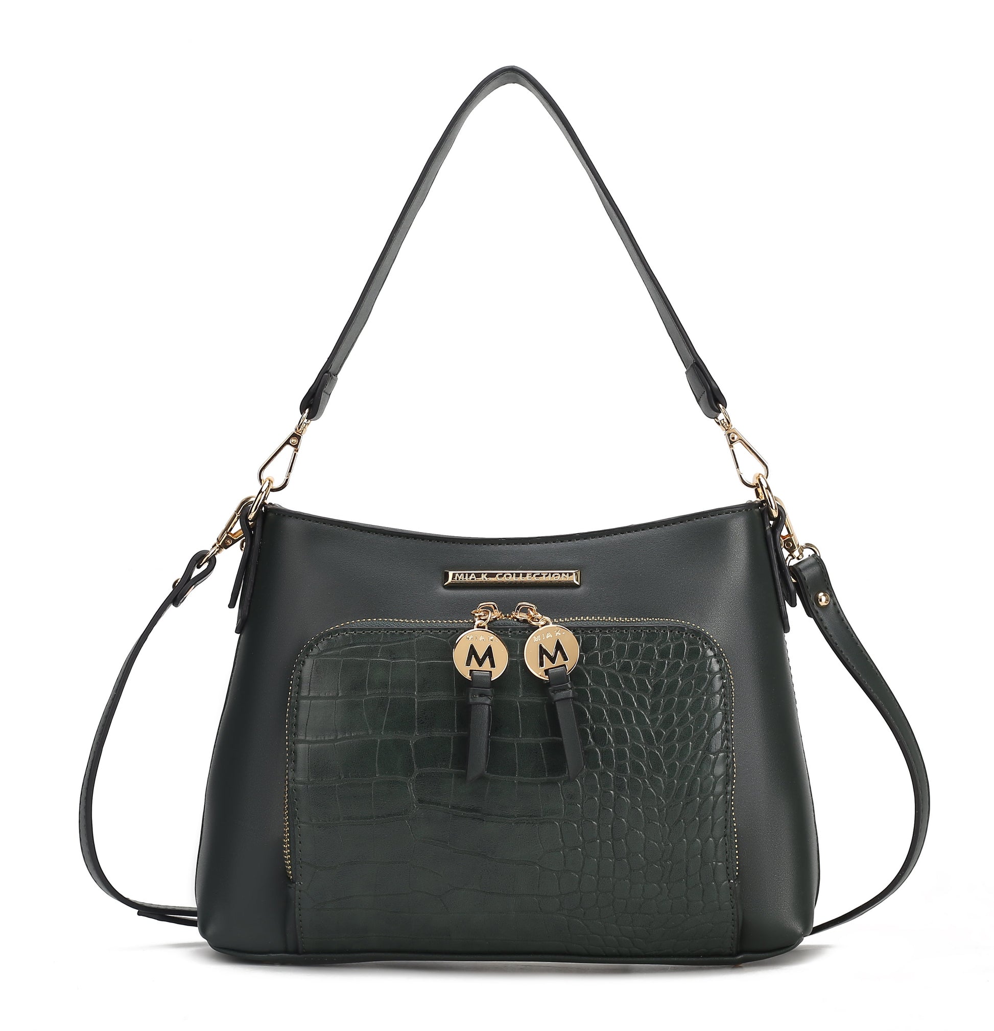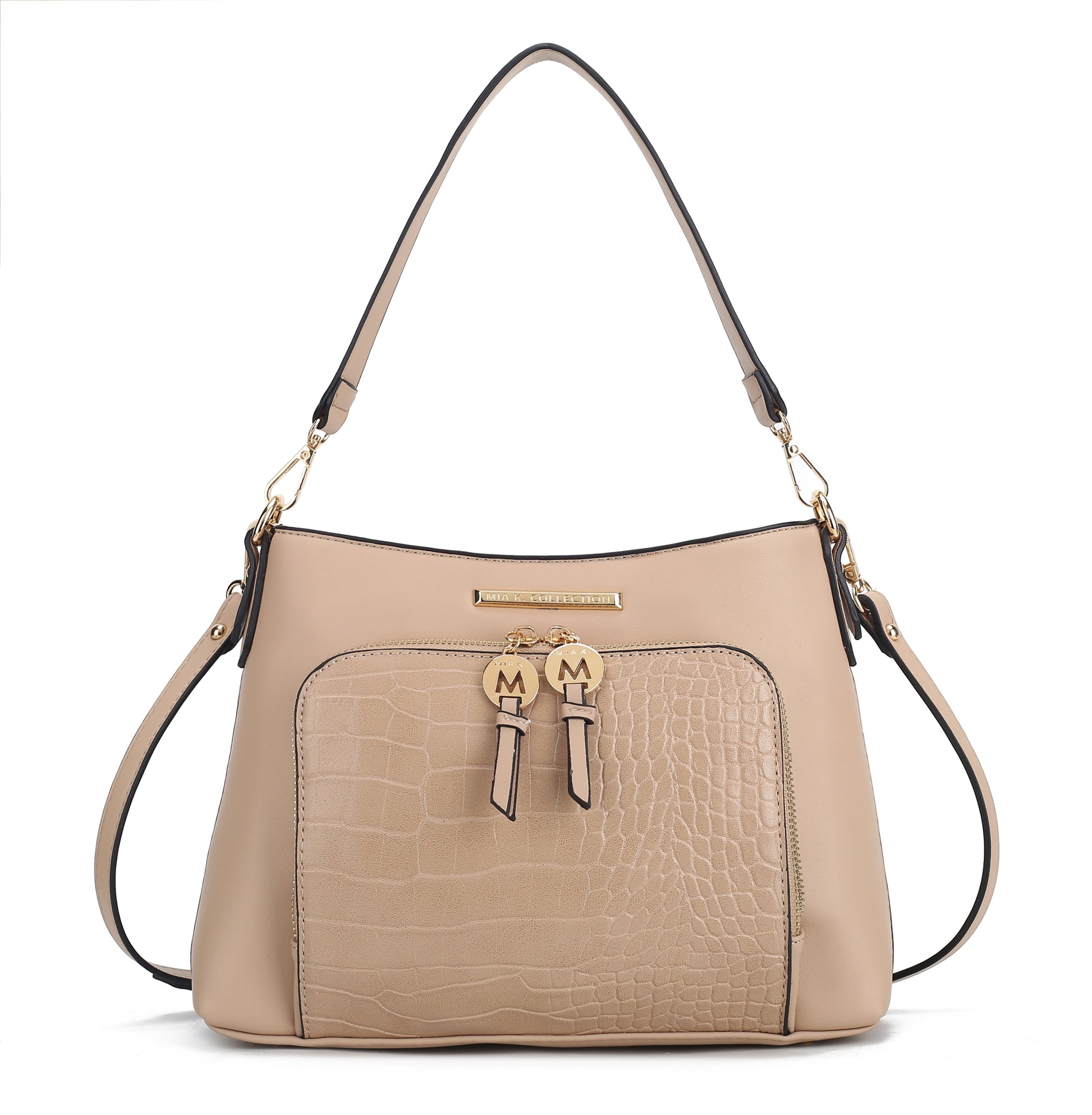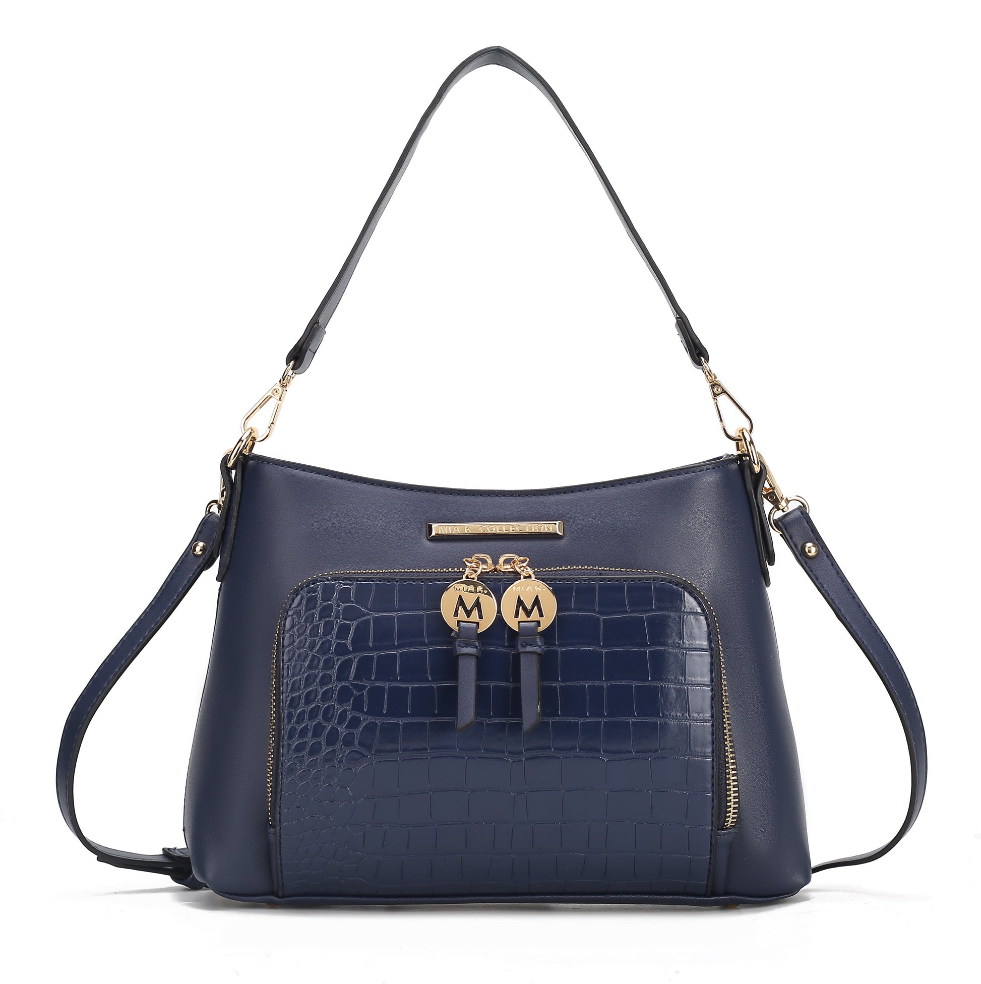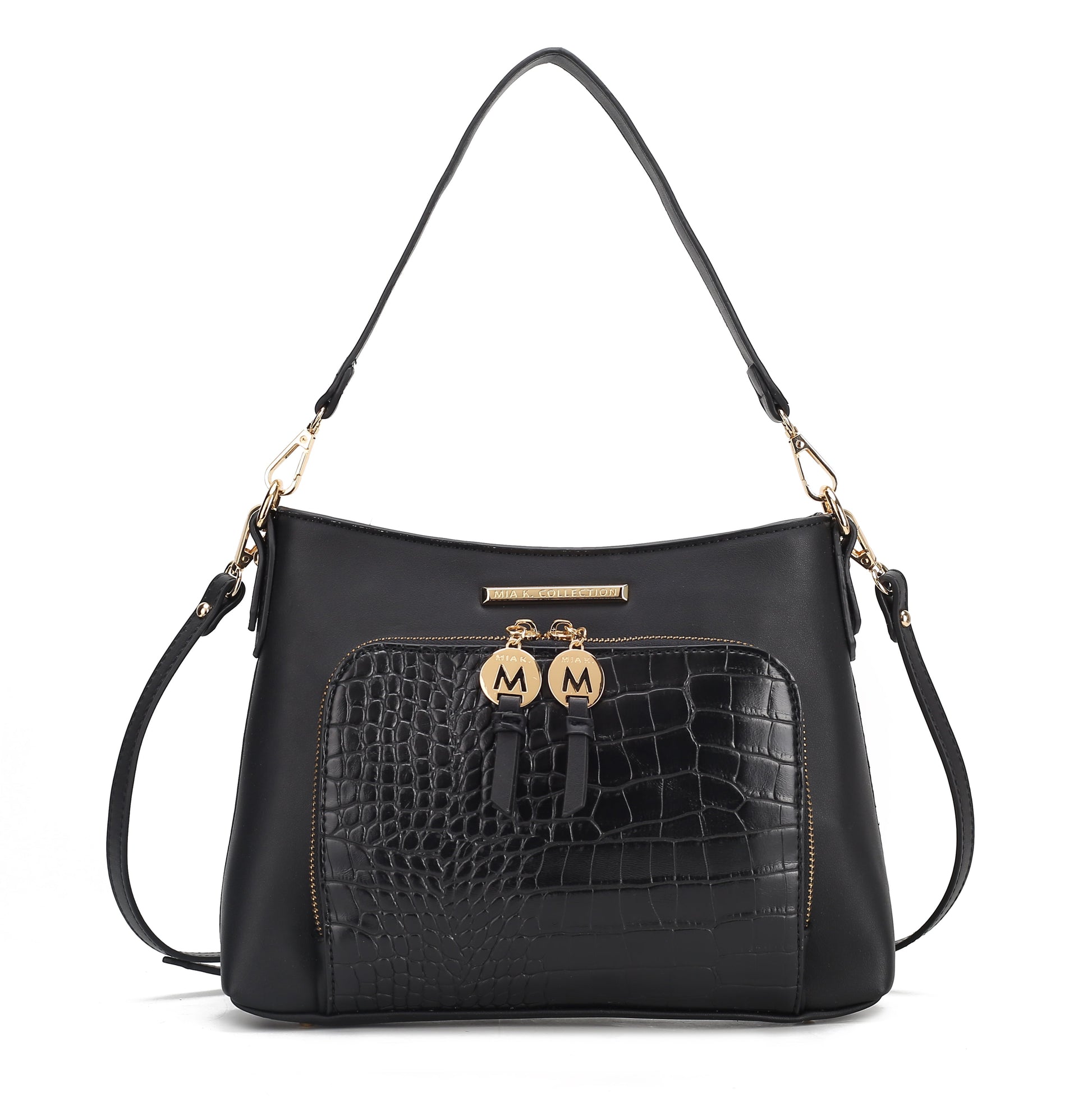 Our Anayra Handbag/Shoulder Bag effortlessly combines style with versatility. The Anayra Handbag/Shoulder Bag unzips to reveal a fully lined interior with slip pockets and a wall zippered pocket. Wear it on your shoulder/ Handbag or adjust the detachable strap to style it crossbody. The Anayra Handbag has a front pocket crafted from luxe crocodile-embossed vegan leather and a back zippered pocket. The bag is designed with gold-tone embellishments, has a structured silhouette and a flat base with feet for stability.