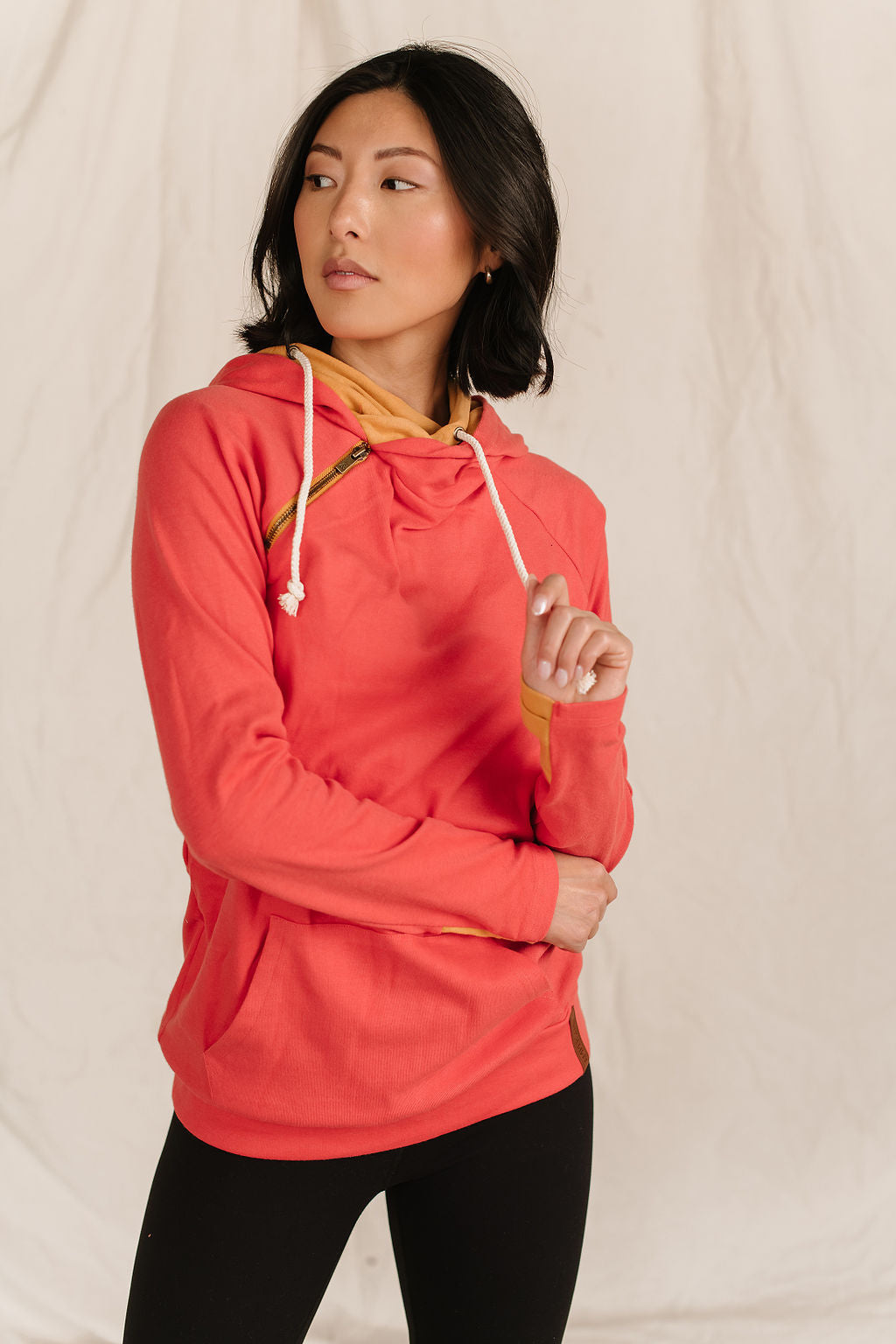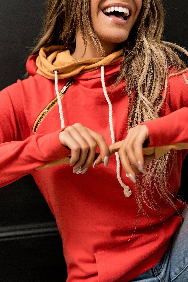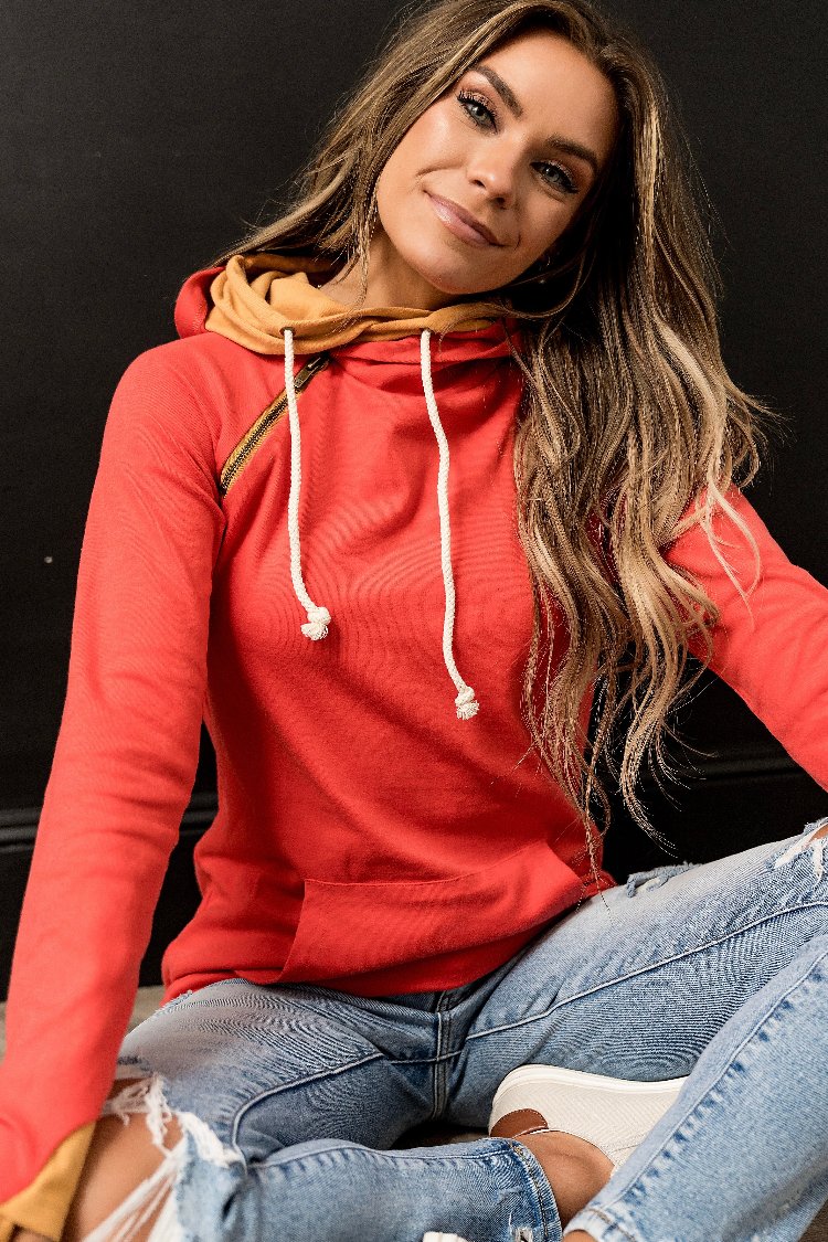 Introducing the Cincinnati Basic DoubleHood™ by Ampersand Avenue - a captivating combination of boldness and style. This striking hoodie features a vibrant red body paired with eye-catching mustard yellow accents, making it a standout piece in your wardrobe.