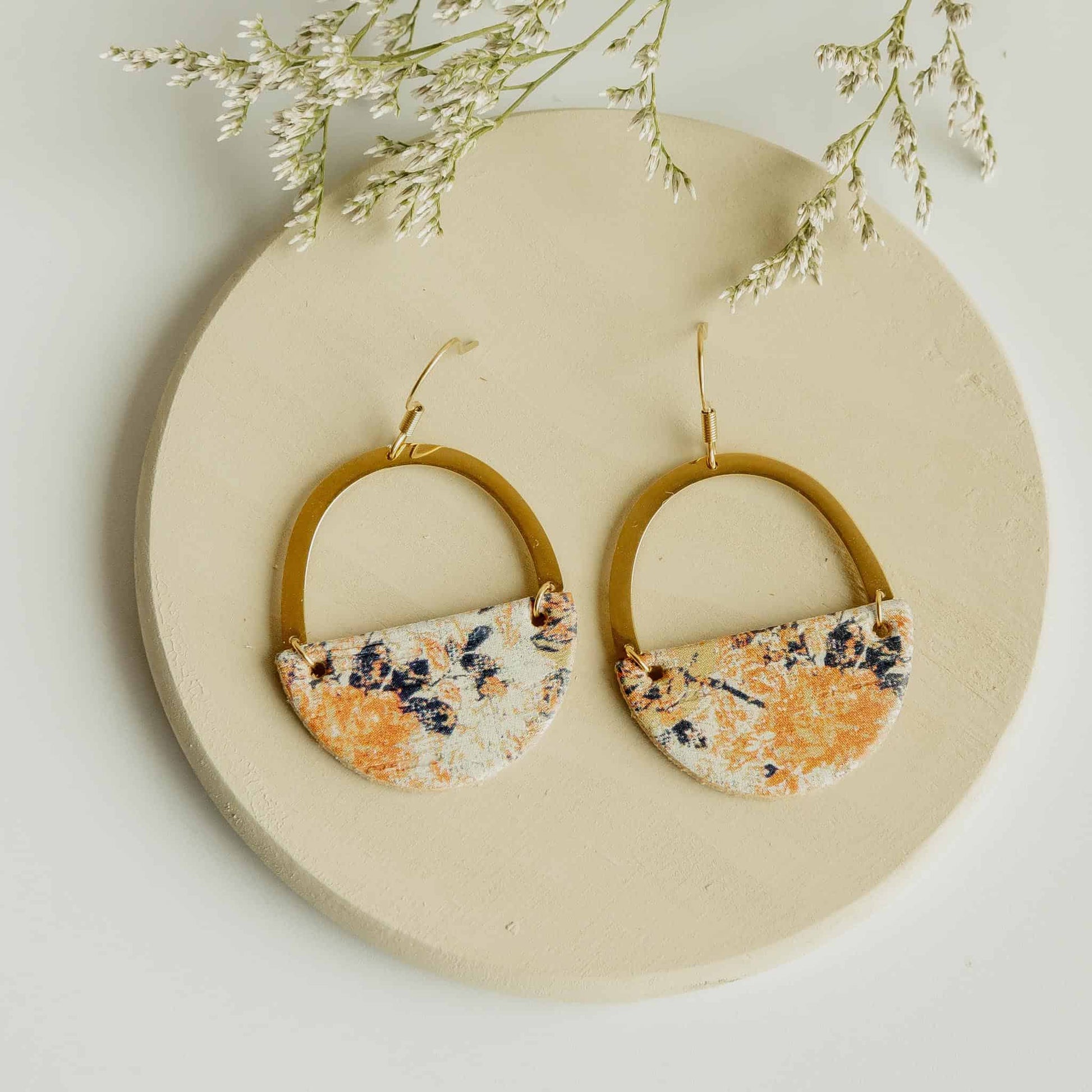Unleash your playful side with the Delia Jo Earrings! Handmade in our studio, these lightweight cork leather earrings feature a pop of orange and deep blue print, adding a touch of vintage florals to any outfit. Upgrade your look with these unique, statement earrings.