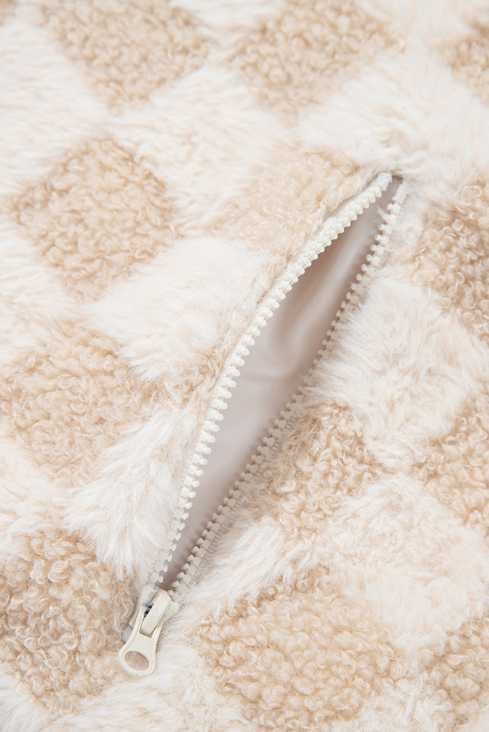 Meet Emily Zip Up Collared Jacket—effortless, flattering, and easy to style for everyday life. Stay cozy and stylish in this Sherpa Jacket. It’s fashionable with a playful checker pattern. Contrast corduroy detailing and zip up design. Convenient pockets design is functional and decorative. Jacket for any fashionable adventure.