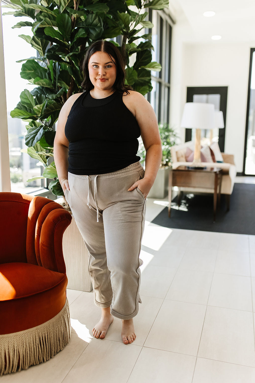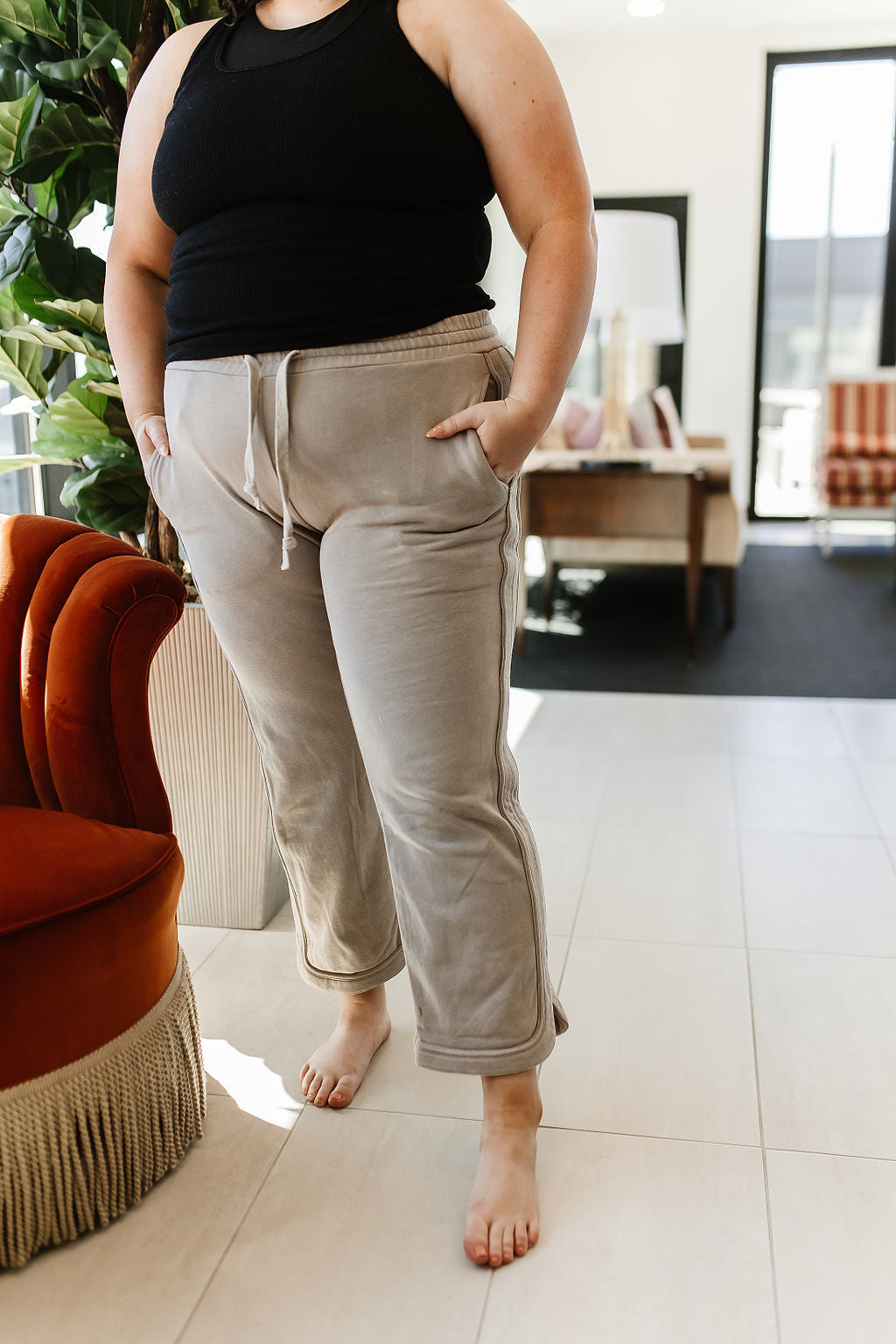 The straight leg fit gives a timeless aesthetic that transitions seamlessly from casual to slightly elevated occasions. The cropped hem design adds a modern twist, making these lounge pants a versatile addition to your wardrobe. The rounded side slit hem detail provides an extra elevated touch.