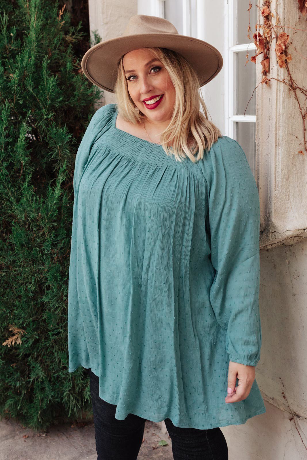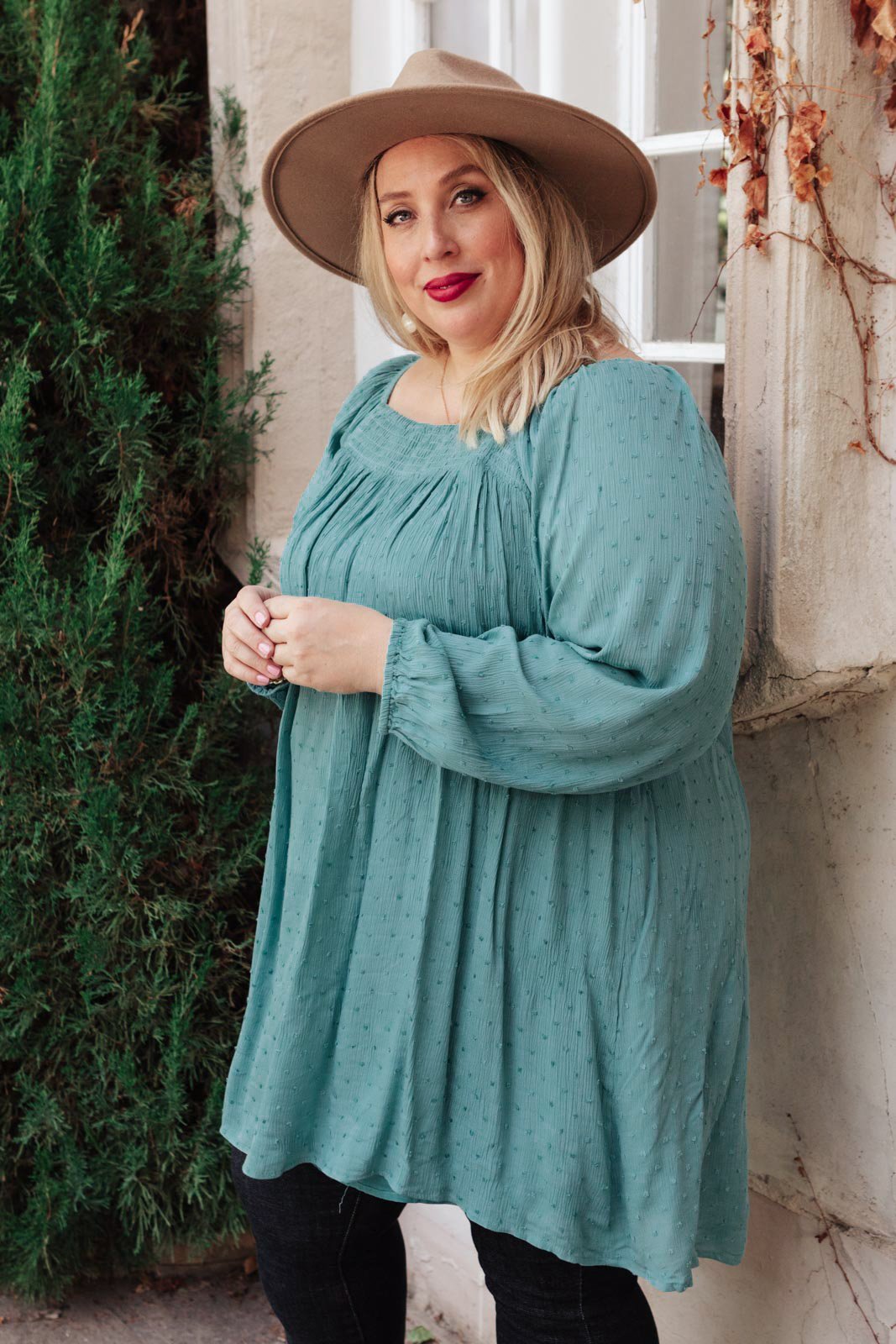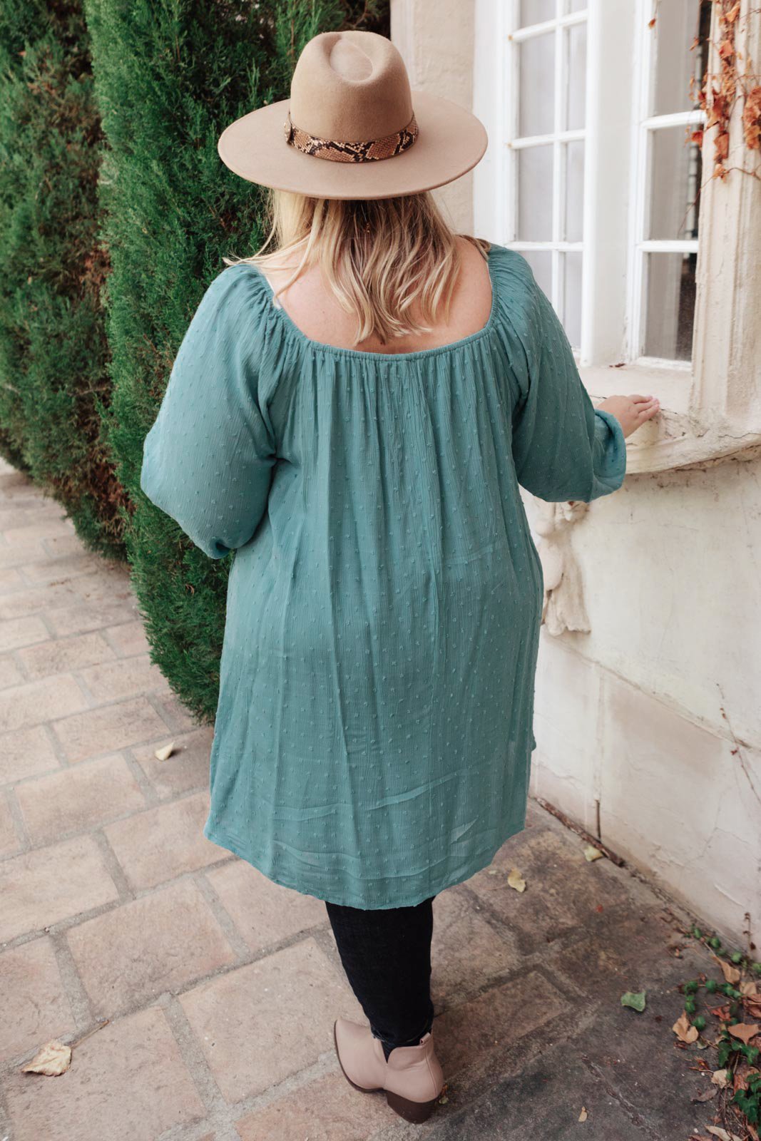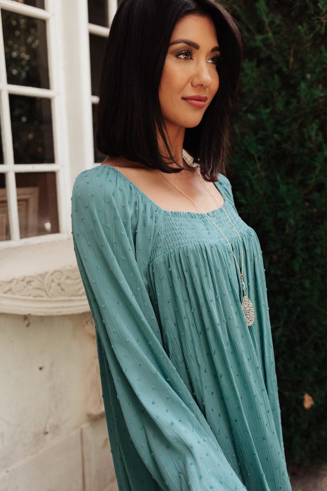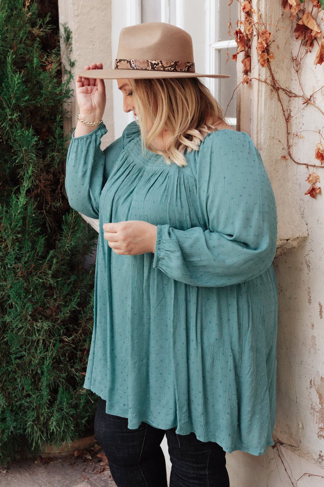 The Lake House Swiss Dot Tunic is your perfect transition weather tunic! This darling dress is made from an ocean blue fabric with Swiss Dot details. We love the stretchy smocked neckline that gives this tunic a romantic silhouette. Pair this tunic with ankle boots and a fashionable hat.