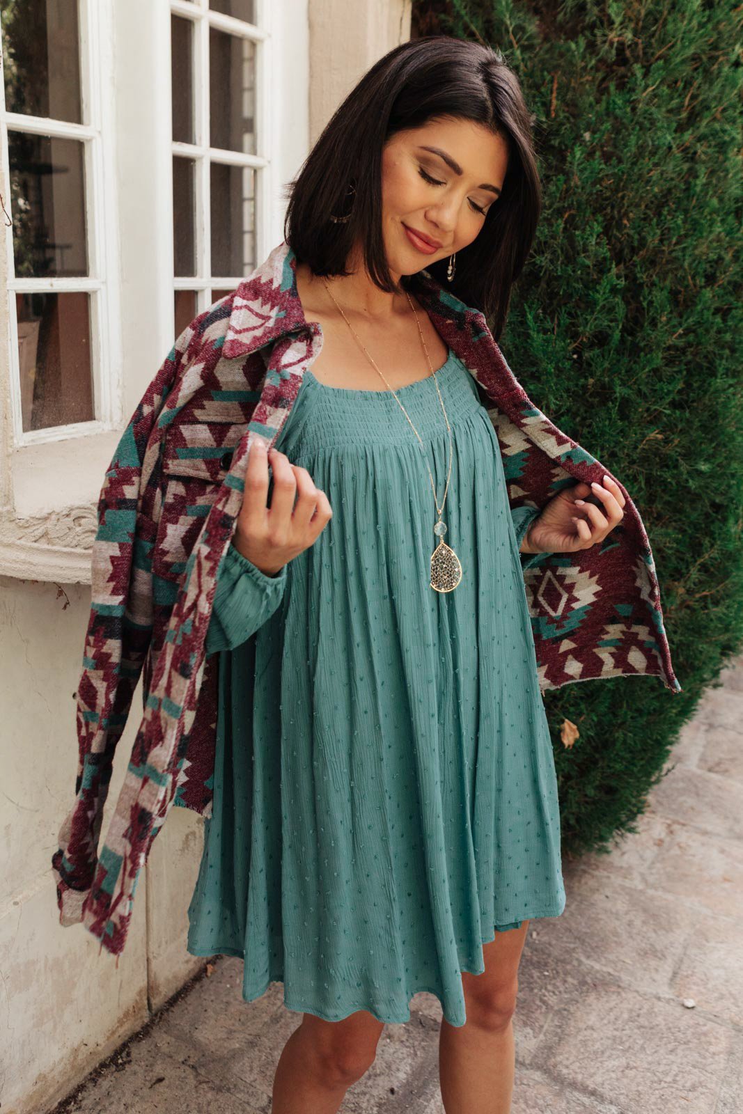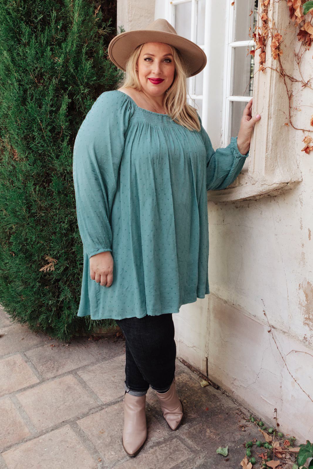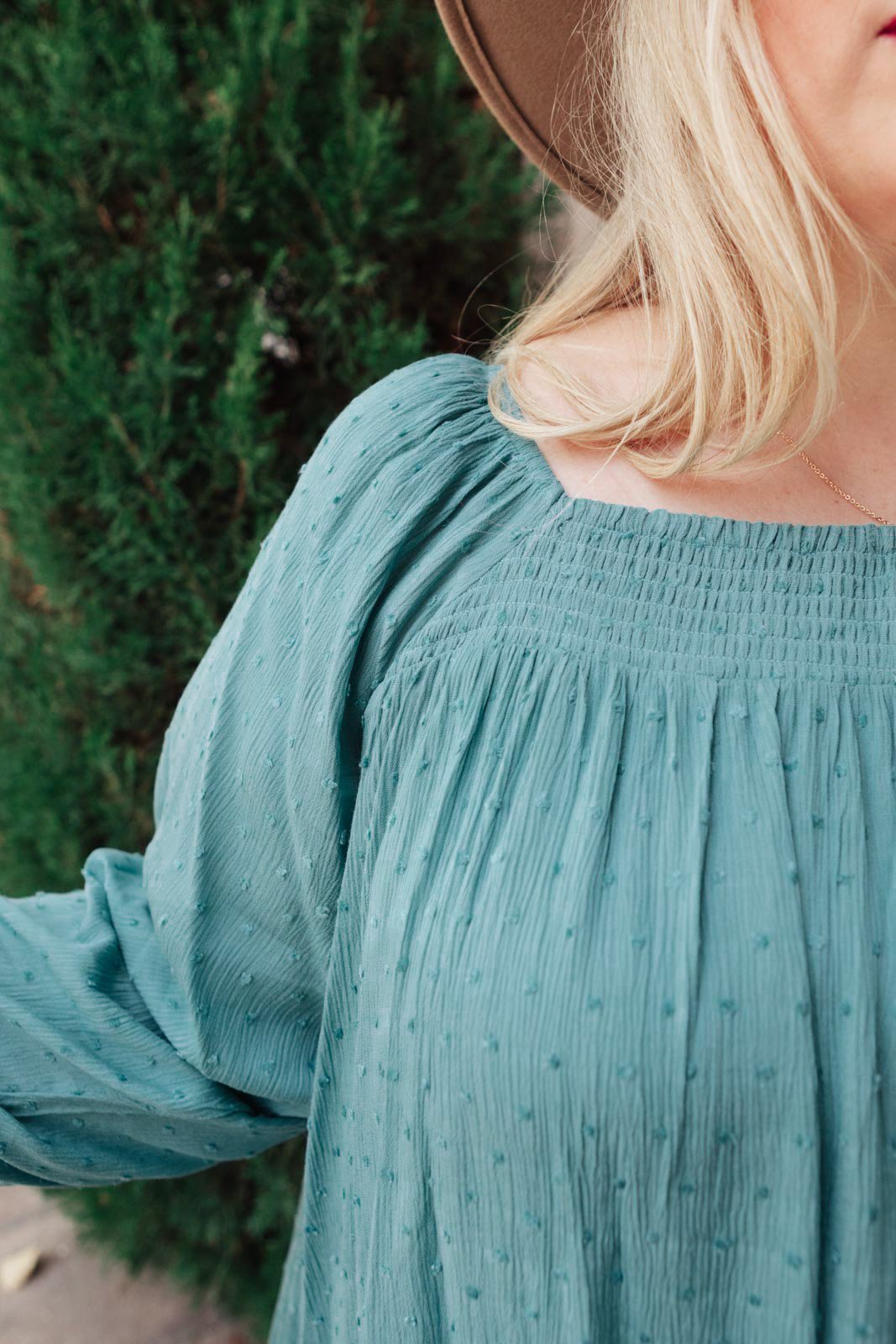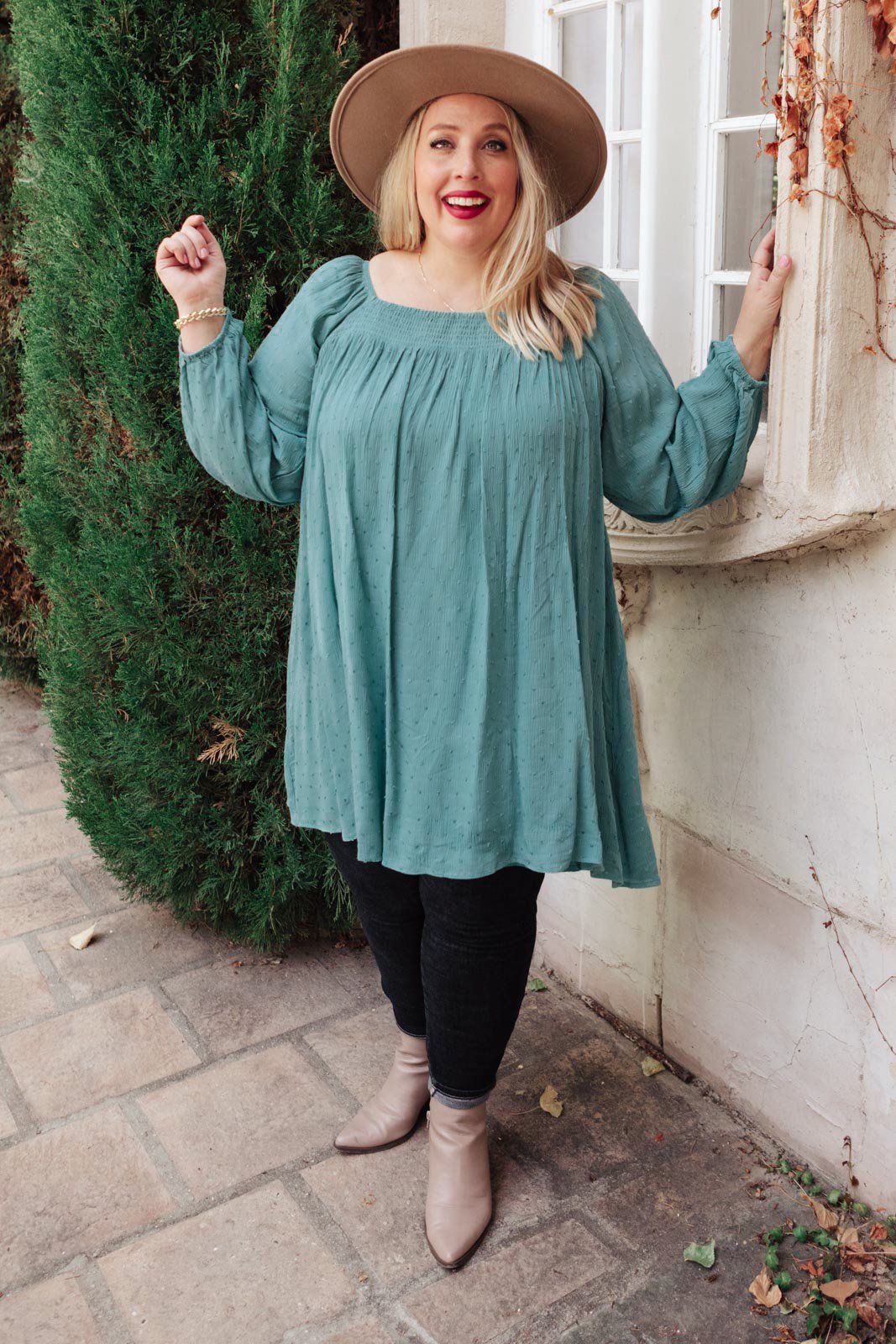 The Lake House Swiss Dot Tunic is your perfect transition weather tunic! This darling dress is made from an ocean blue fabric with Swiss Dot details. We love the stretchy smocked neckline that gives this tunic a romantic silhouette. Pair this tunic with ankle boots and a fashionable hat.