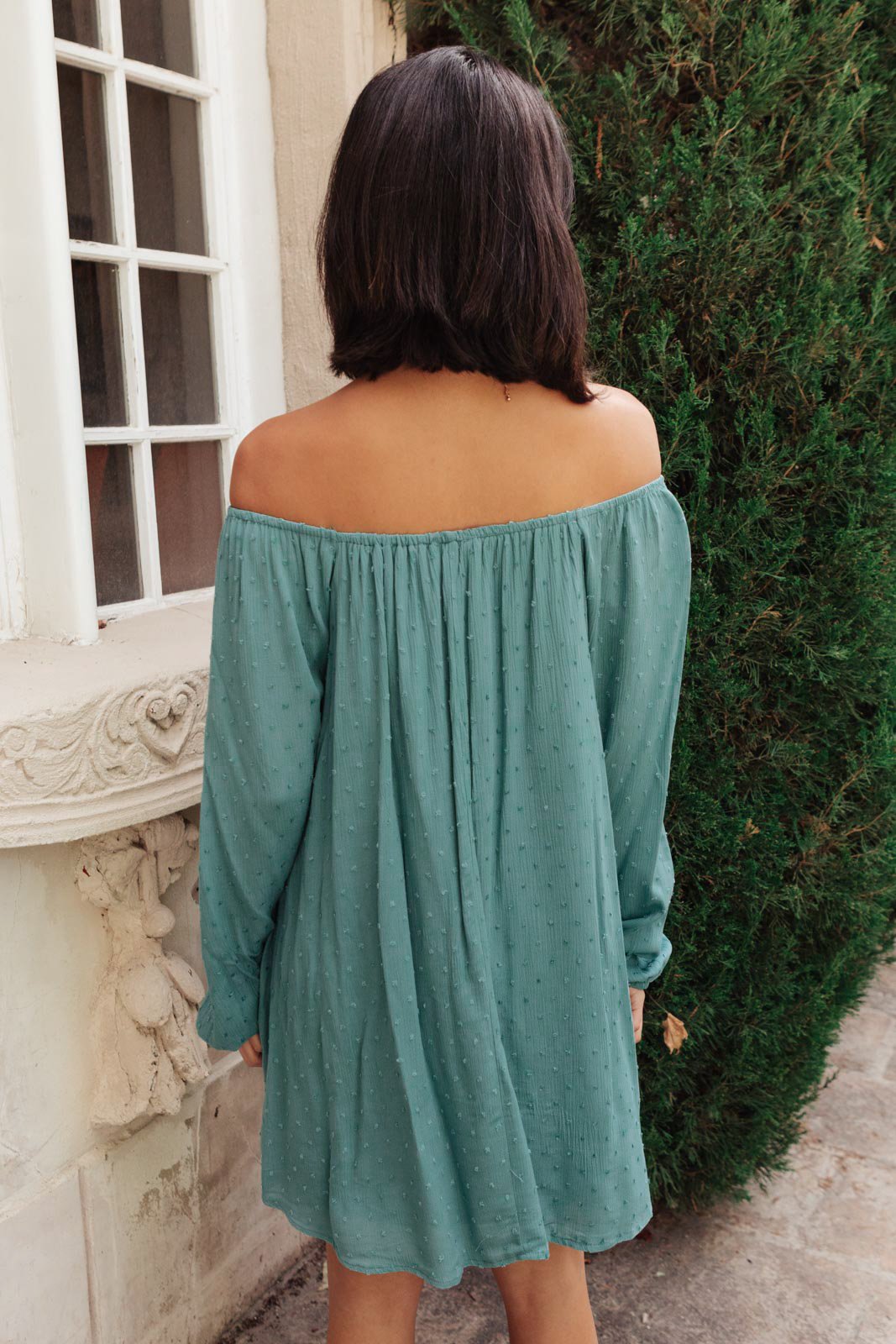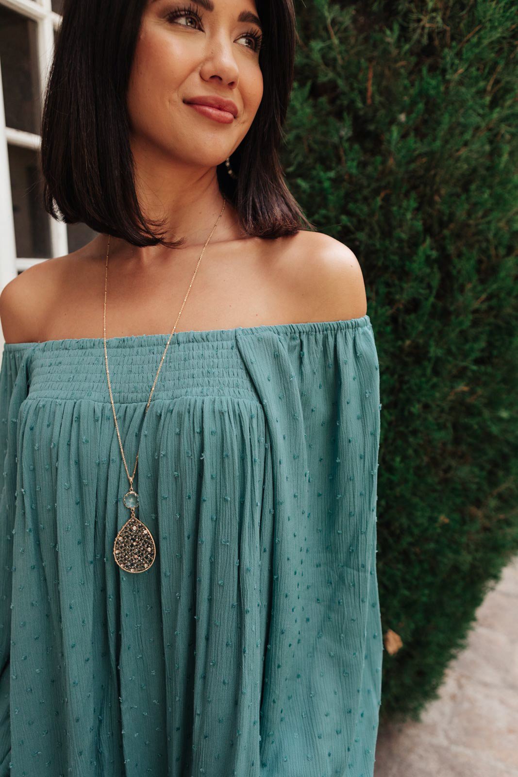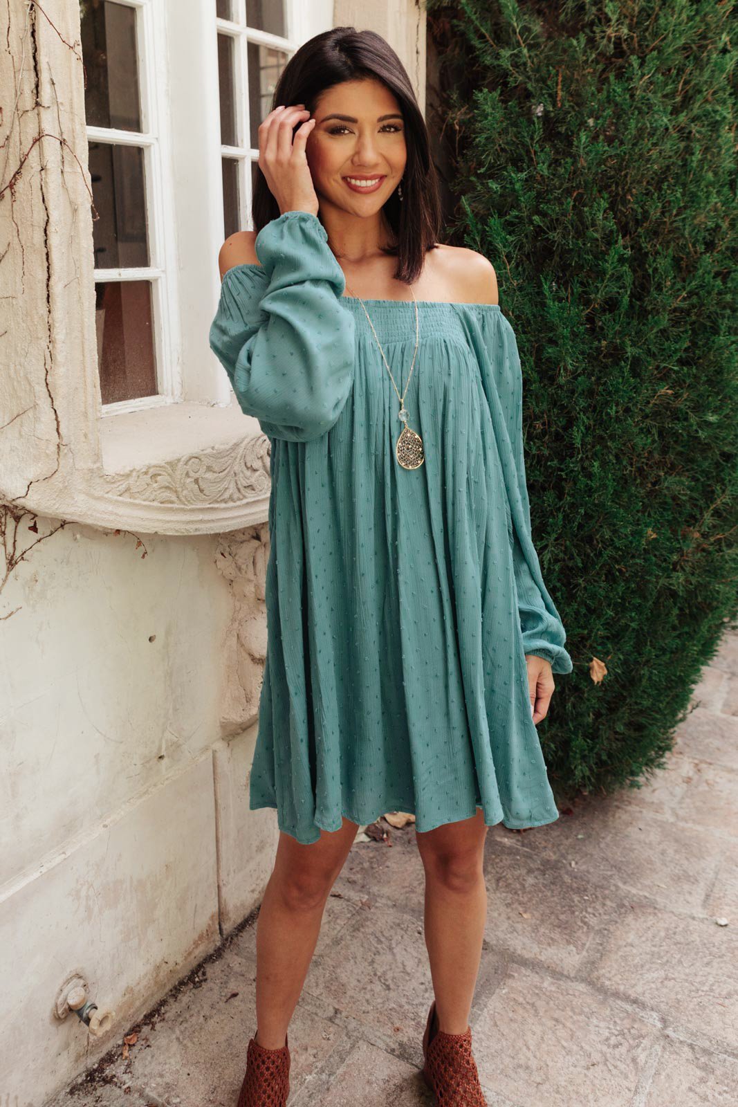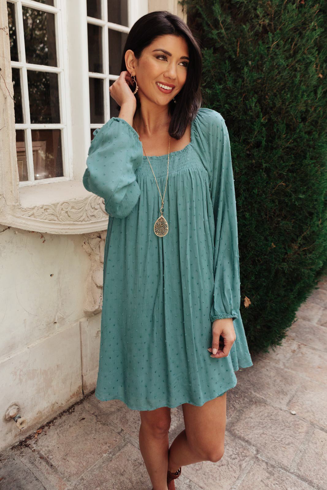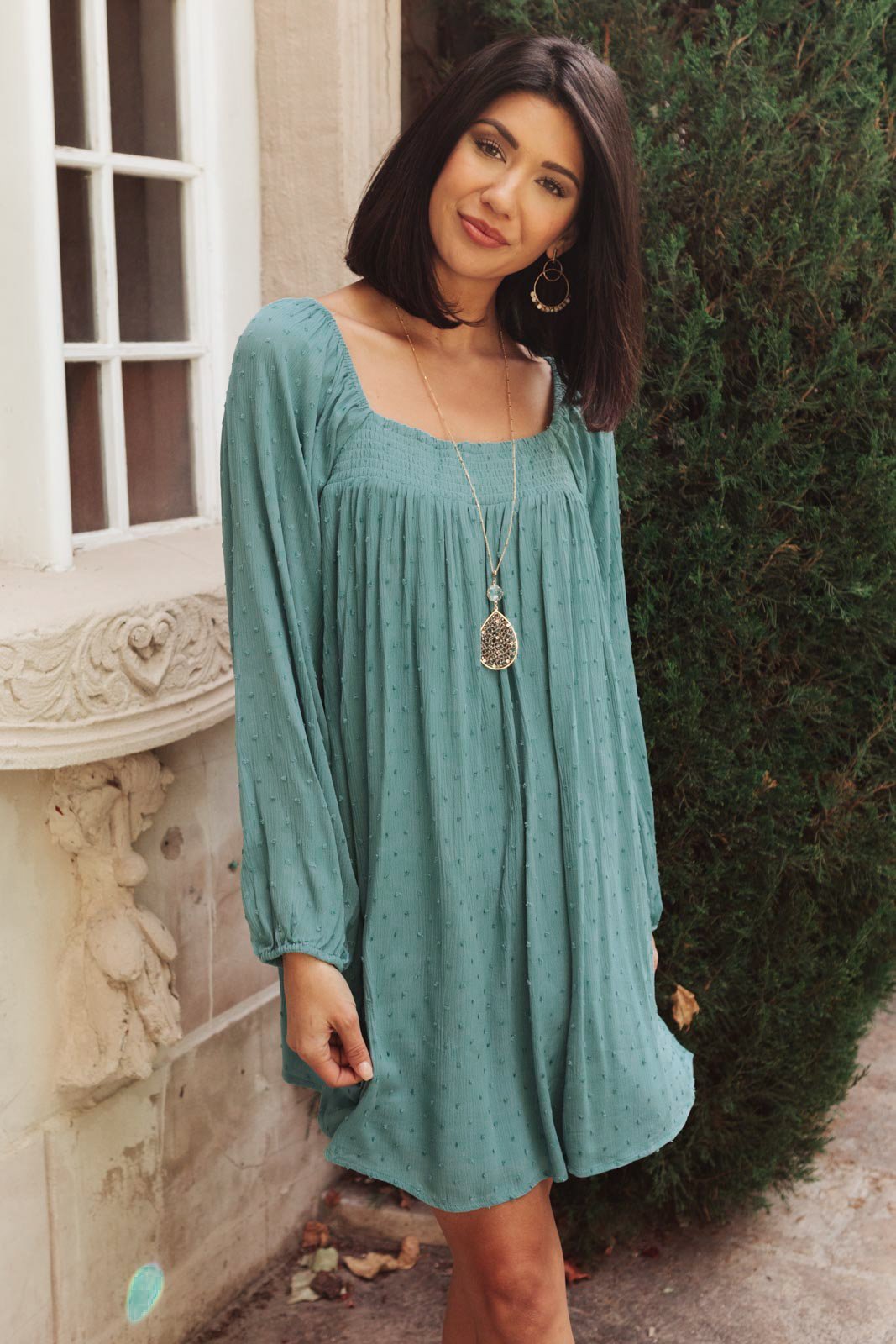 The Lake House Swiss Dot Tunic is your perfect transition weather tunic! This darling dress is made from an ocean blue fabric with Swiss Dot details. We love the stretchy smocked neckline that gives this tunic a romantic silhouette. Pair this tunic with ankle boots and a fashionable hat.