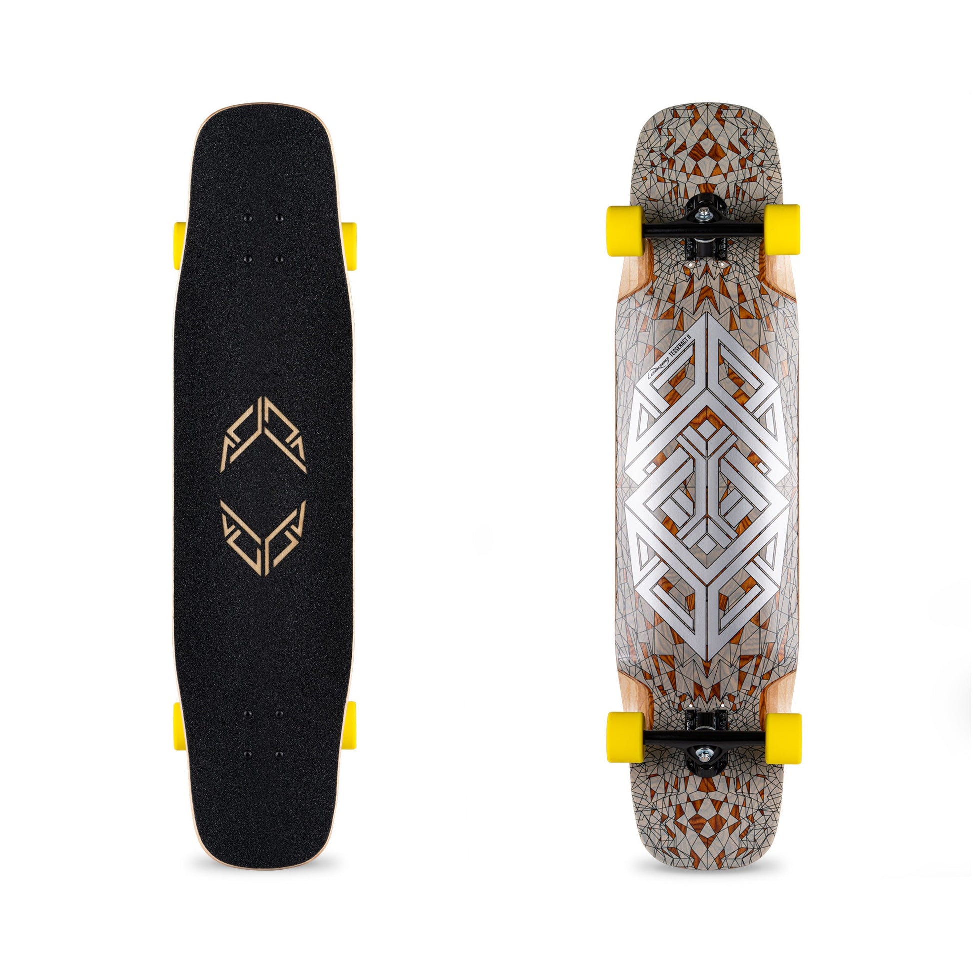 The Tesseract II is your portal to high-performance freestyle and freeride. Its micro-drop platform locks you in for an immersive connection, while symmetrical double kicks defy gravity, opening up a universe of possibilities. Built with six plies of long-grain maple and tri-axial fiberglass, it's engineered for perfect stellar stiffness and explosive pop. Laser-cut 50-grit griptape and machined wheel wells keep you grounded, while the photochromic graphic hints at new dimensions in your skateboard progression.