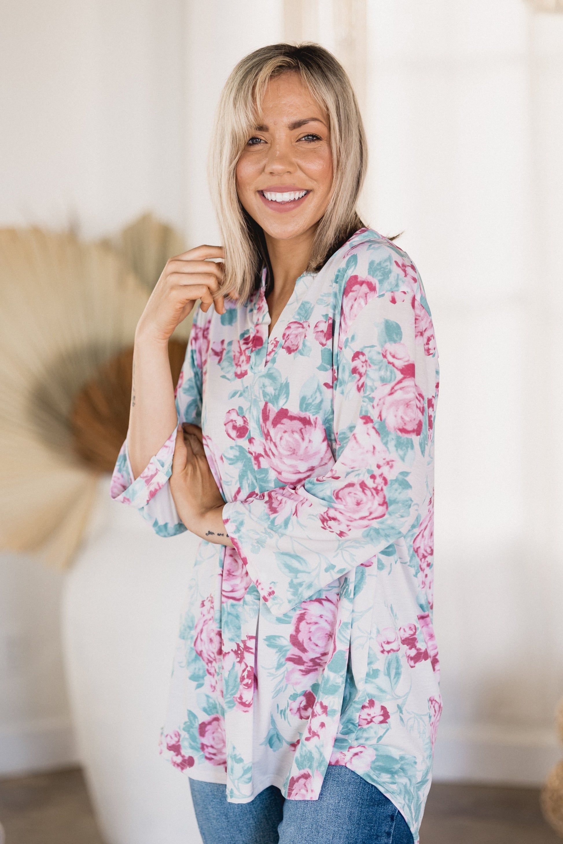 Set your world alive, with this beautiful floral printed 3/4 sleeve top. With a relaxed fit, this top features a round neckline with v-cutout, 3/4 sleeves and hi lo hem.