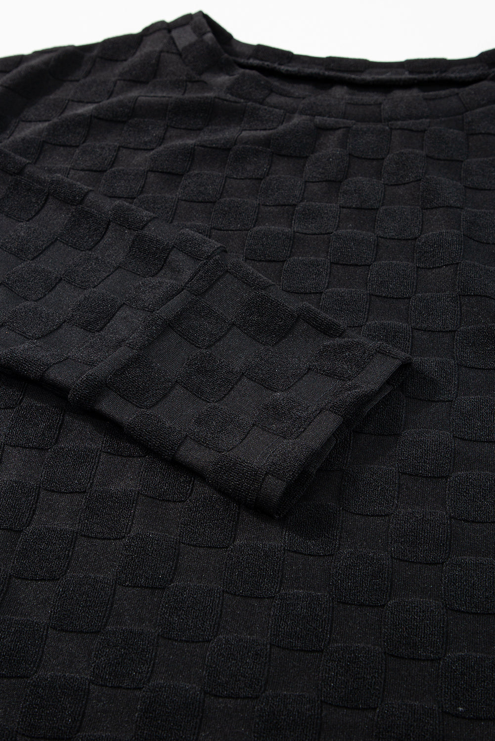This top is a staple in any fall fashion collection. Its textured pattern creates a captivating look that is sure to turn heads. The crew neck, thumbhole sleeves, and side slits offer comfort and style. Pair it with skinny pants, shorts, or jeans for a solid colored outfit that exudes confidence