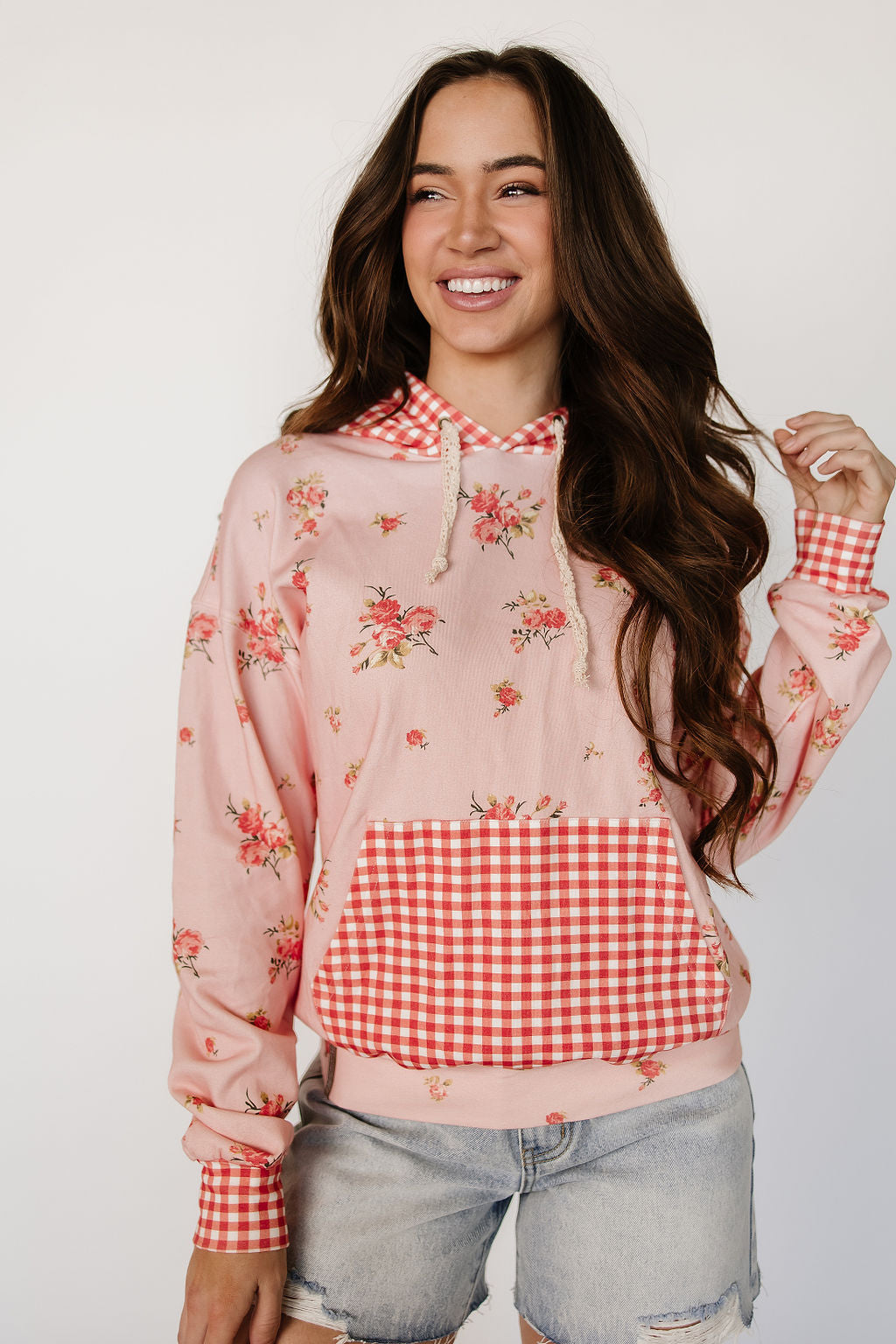 A sweet floral print with gingham accents on everyone's fav hoodie!