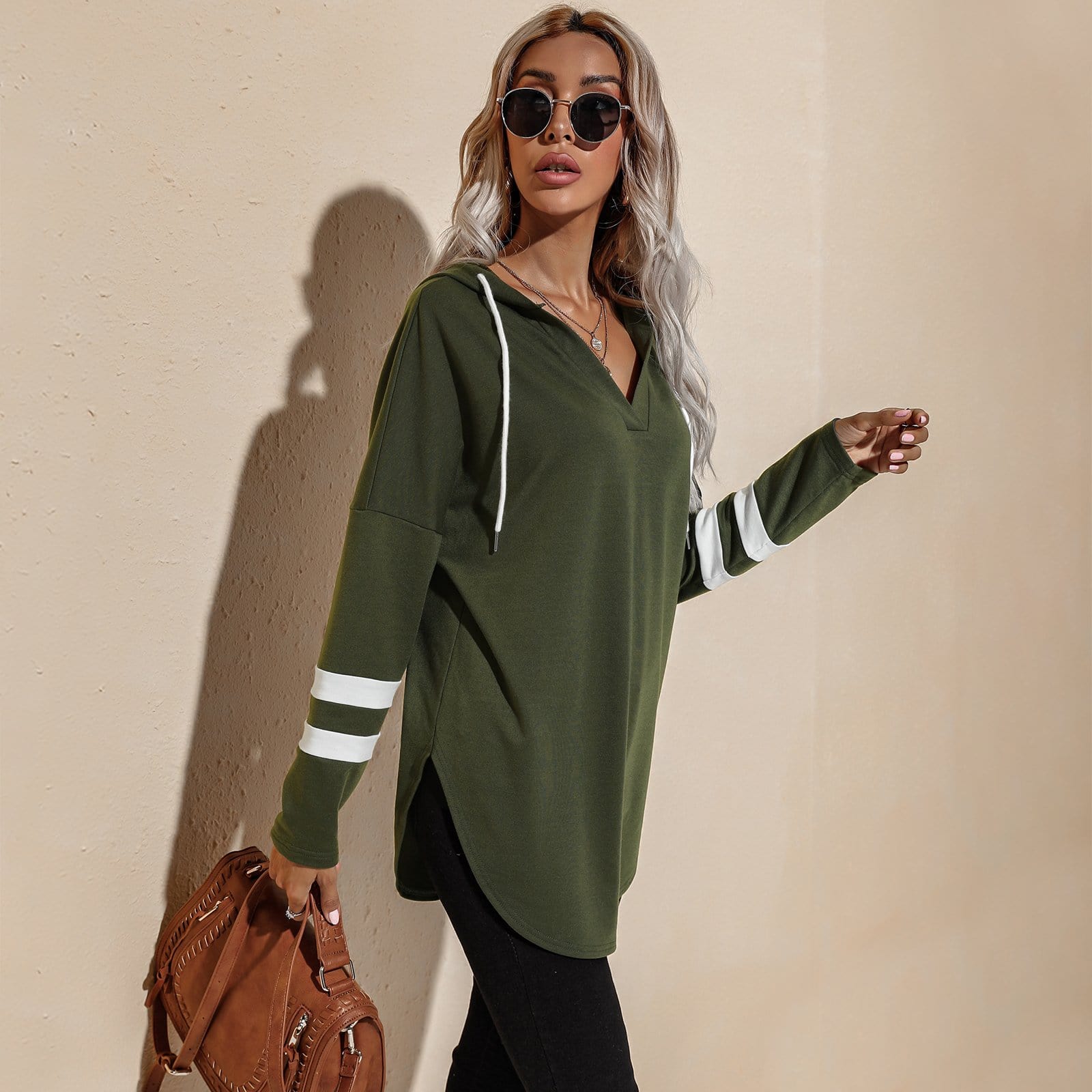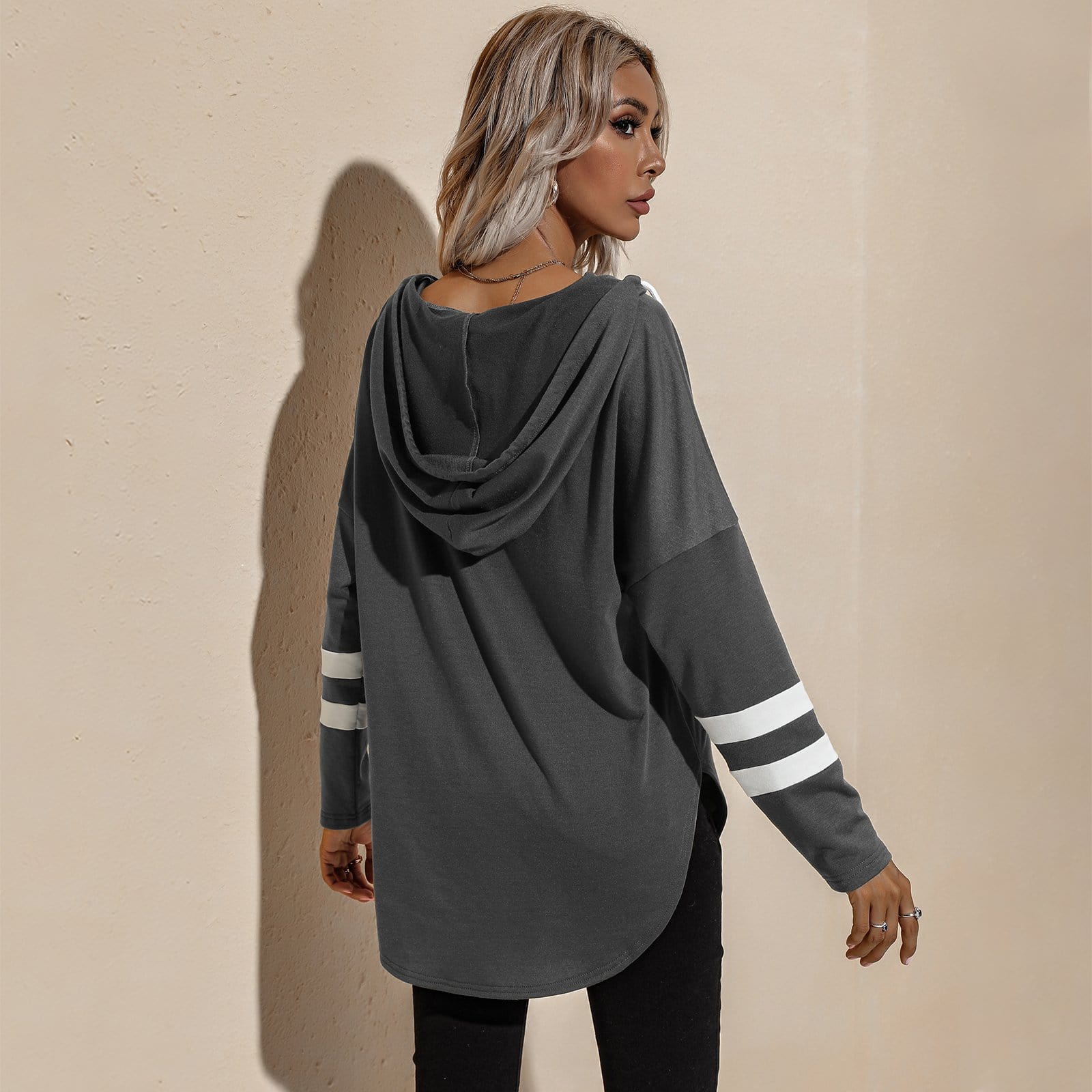 ??he Anna-Kaci sweater is detailed with a sporty look with double thick stripes on the sleeves. Features a v neck line, drawstring hoodie, drop shoulder, long sleeves, rounded hem, and oversized fit. Pair it with black ripped jeans and sneakers for a casual look.