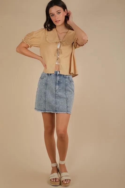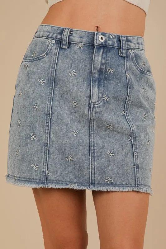 The bow printed casual denim mini skirt is a fun and flirty addition to your wardrobe. Its playful bow print adds a charming touch to the classic denim style. Perfect for creating a cute and casual outfit for various occasions.